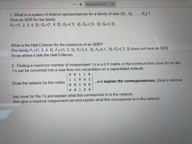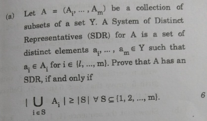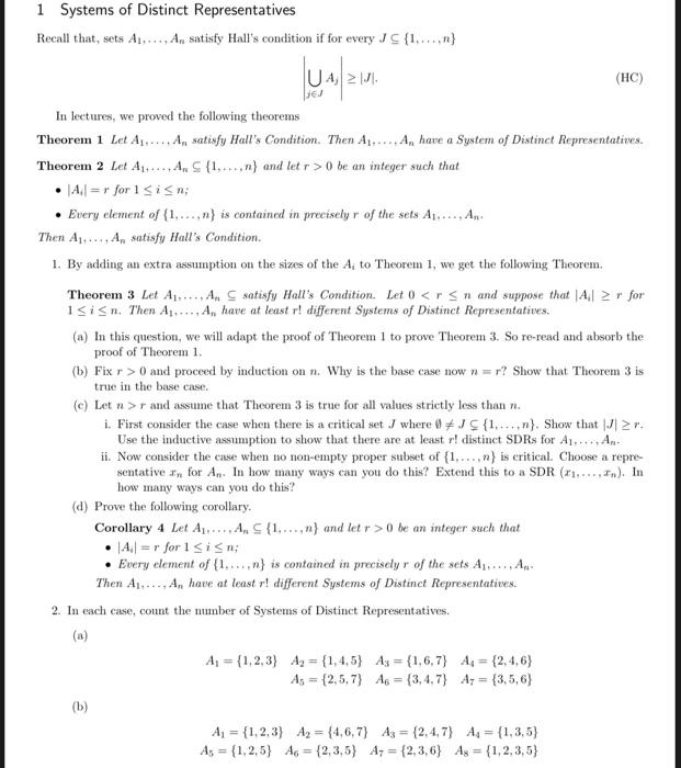 B without using Halls theorem. In the framework of combinatorial mathematics systems of distinct representatives play an important role in questions of choice and in extremal problems. Philip Hall 2 proved that the family F has an SDR if and only if for each integer k l k 1 the union of any k of the Fi contains at least k elements. Introduction to Graph Theory. Systems of distinct representatives are used both in purely combinatorial mathematical studies and in applications to linear programming mathematical economics and cybernetics. Transversal Line PQ is a transversal. A system of distinct representatives or SDR for the family is a family x 1x n of elements of A satisfying the conditions x i in X i for i1n. Euler Circuits and Walks. Halls theorem to infinite families of finite sets.