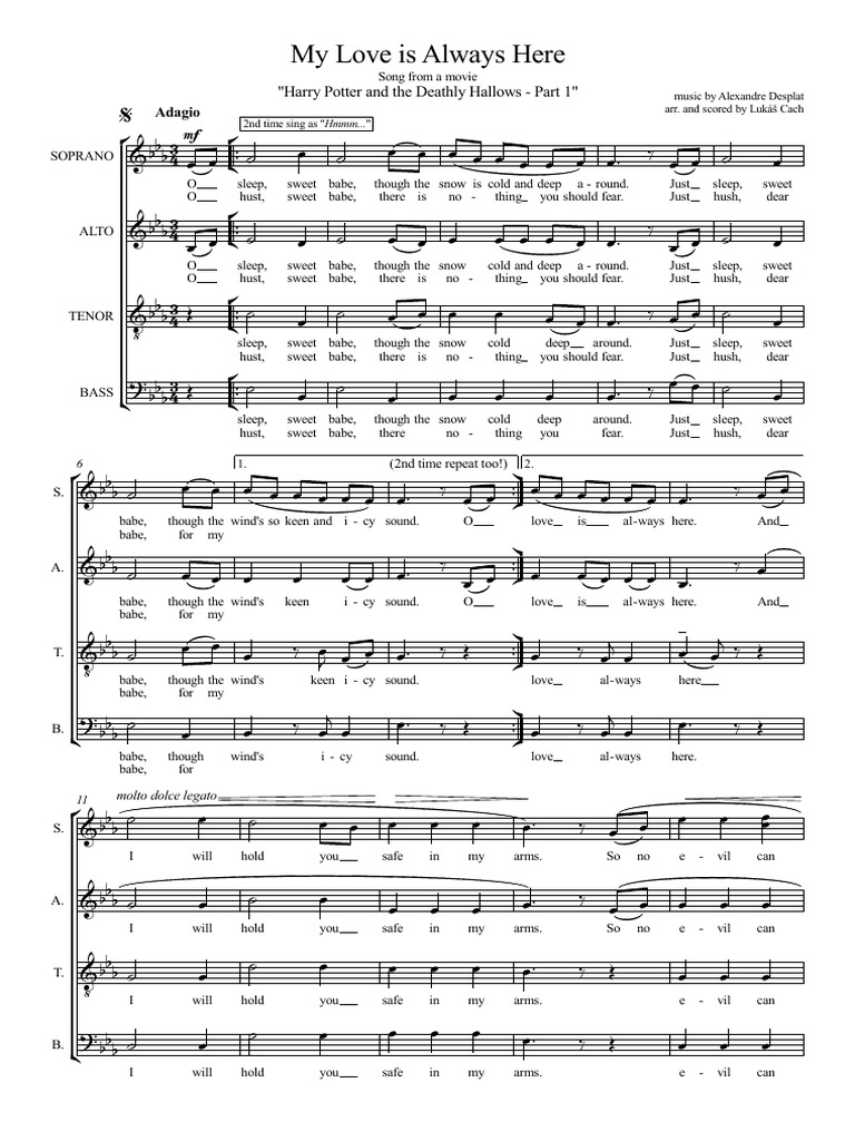 My Love Is Always Here London Voices. Download PDF - My Love Is Always Herepdf d49o18k6e149. To maintain this website we need your help. By Alexandre Desplat - HP the Deathly Hallows- Part I soundtrack by Kikisabel on desktop and mobile. The Lyrics for My Love Is Always Here by Alexandre Desplat have been translated into 1 languages Oh sleep sweet babe Though the snow is cold and deep around Just sleep dear babe Through the winds so keen and icy sound Oh hush sweet babe There is nothing you should fear Just hush dear babe For my love is always here. My Love is Always Here is a bonus track from the Harry Potter and the Deathly Hallows. My Love is Always Here was a Christmas song sung by the attendees of the Christmas mass at the Parish Church of St.